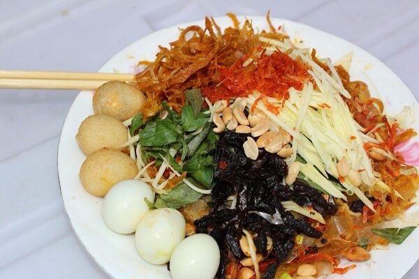 Bánh tráng được trộn theo nhiều cách. Thành phần chính gồm những miếng bánh tráng được cắt nhỏ, con ruốc đã tẩm ướp, muối tôm xay nhuyễn, ớt sa tế. Nhiều nơi vắt thêm miếng chanh, cho thêm khô bò xé sợi, rau răm và trứng cút. Một phần có giá 10.000 đồng. Các tiệm nổi tiếng được nhiều thực khách ghé mua ở Nguyễn Thượng Hiền, hồ Con Rùa, công viên Lê Văn Tám.