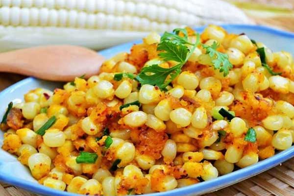 Bắp để xào thường là bắp nếp dẻo thơm, được tách hạt, xào cùng tôm khô, con ruốc và hành lá. Người thích ăn cay thì cho thêm ớt sa tế, người thích ăn mặn thì dặn người bán cho thêm xíu muối hoặc bột nêm. Một hộp bắp xào có giá 10.000 đồng.