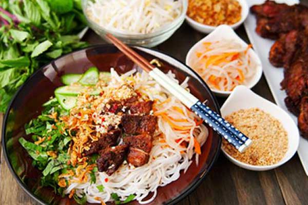Ai đến thị xã Hồng Lĩnh đều nên thử món bún thịt nướng thơm ngon này. Thịt nướng không quá nạc hoặc quá mỡ, thường là thịt nạc vai. Điều đặc biệt của món này còn là một loại gia vị, dân địa phương gọi là chẹo - chế biến từ nước tương, trộn với lạc rang giã nhỏ, thêm ớt tỏi đường. Nước chấm sánh quện và không đặc, khi ăn mùi của chẹo làm đậm đà thêm vị thịt và nét thanh mát của bún. Thực khách trộn bún lẫn với nước tương và ăn kèm thịt. Bún thịt nướng ở Hà Tĩnh bán cả ngày nên khách có thể thoải mái lựa chọn thời điểm đi ăn. Suất một người có giá khoảng 30.000 đồng. Những phố ở thị xã Hồng Lĩnh có nhiều quán bún thịt nướng để du khách lựa chọn là Trần Phú, Phan Anh, Nguyễn Ái Quốc..