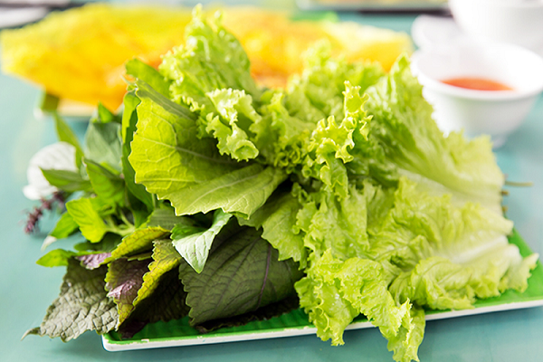 Bánh xèo miền Tây sẽ mất ngon nếu thiếu đi hai yếu tố quan trọng nữa là rau và nước chấm. Rau ăn bánh xèo cũng chủ yếu là các loại rau dân dã miền Tây như rau diếp ca, cải xanh, xà lách, húng quế, thơm, dưa leo… Nước chấm thường là nước mắm được pha từ nước mắm mặn thêm ít ớt và đồ ngâm chua. Bánh xèo có thể ăn trực tiếp hoặc cuốn cùng bánh tráng.