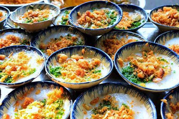 Một trong số món ngon ở Quy Nhơn phải nhắc đến đó là bánh bèo. Món ăn vặt có màu sắc bắt mắt khi có lớp mỡ hành xanh lá, hành phi vàng ruộm cùng đậu phộng giã nhuyễn, ít ruốc tôm bên trên. Bánh bèo ăn ngon nhất khi còn nóng, lớp khói bao quanh miệng chén. Bột vừa chín tới có độ mịn. Hương vị của món ăn còn được tạo nên bởi những mẩu bánh mì giòn rụm. Mỗi chén bánh bèo có giá từ 5.000 đồng.