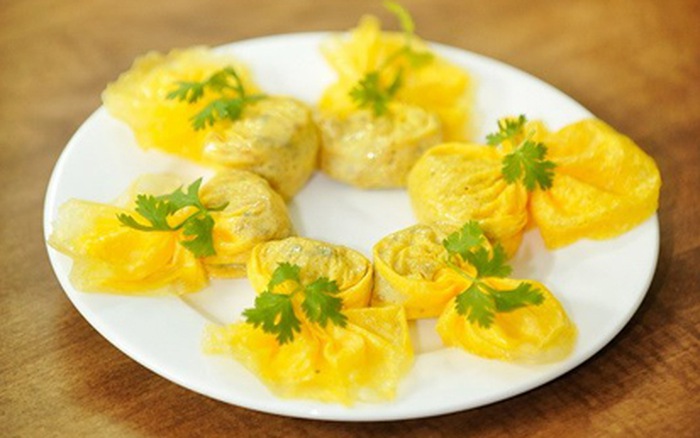 Dùng chảo nhỏ đường kính khoảng 20 cm, nếu có chảo không dính càng tốt. Tráng đều mặt chảo bằng một miếng mỡ lợn hay miếng gạc tiệt trùng tẩm dầu ăn. Để lửa nhỏ cho chảo vừa nóng. Dùng 1 thìa canh, múc trứng vào chảo, nhẹ lắc chảo cho thành 1 lớp mỏng, trứng thừa phải đổ ra. Đặt chảo lên bếp cho trứng vừa chín, múc 1 thìa cà phê nhân đã xào, đặt vào giữa lát trứng mỏng, cầm đũa thật khéo gấp trứng lại. Dùng đũa túm tròn phần trứng có nhân thành 1 cái túi nhỏ. Phần trứng mỏng bên ngoài xoè ra như miệng túi.