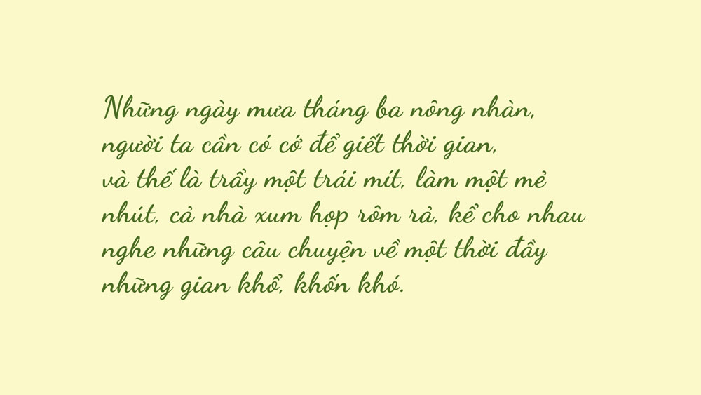 Thời tiết Nghệ An tương đối khắc nghiệt, cuộc sống người dân vô cùng khốn khó. Vào thời đói kém, thóc lúa hết, sẵn nhất trong nhà chỉ có khoai lang và mít xanh. Khoai lang ăn thay cơm, nhút mít được chế biển thành thức ăn mặn.