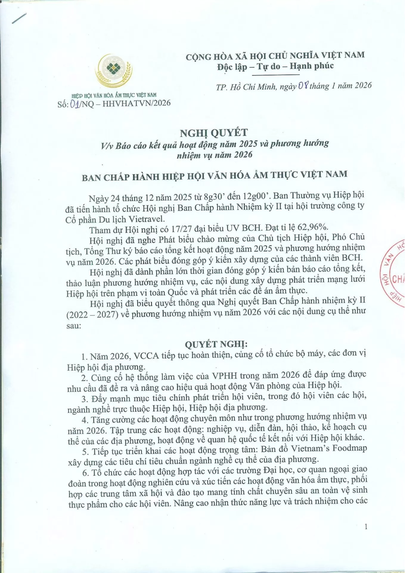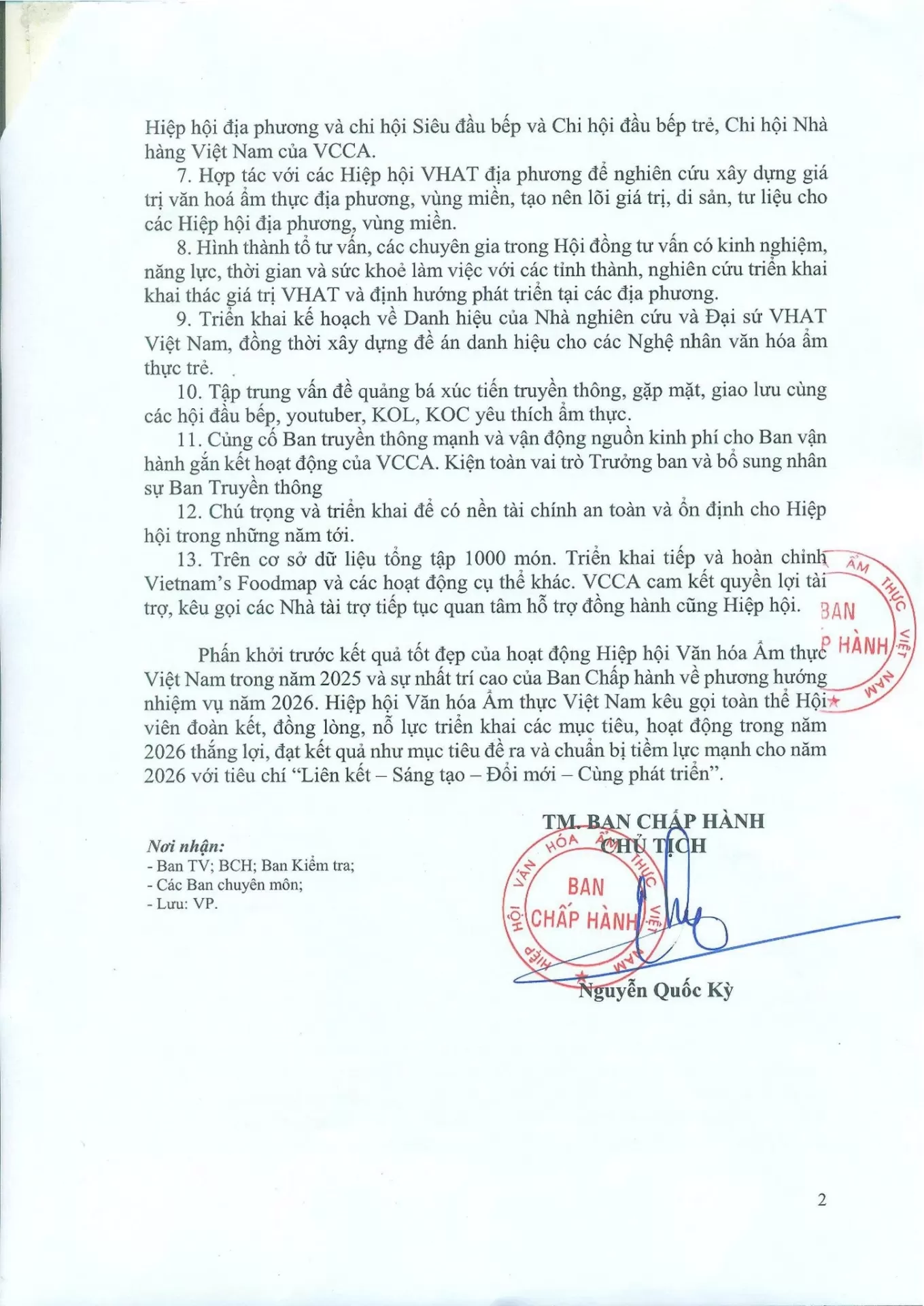 Với tinh thần “Liên kết – Sáng tạo – Đổi mới – Cùng phát triển”, Hiệp hội Văn hóa Ẩm thực Việt Nam kêu gọi toàn thể hội viên và đối tác chung tay triển khai hiệu quả các mục tiêu năm 2026, góp phần đưa văn hóa ẩm thực Việt Nam ngày càng lan tỏa và phát triển bền vững. Rất mong nhận được sự quan tâm và chia sẽ những định hướng mới để cùng phát triển Văn hóa Ẩm thực Việt Nam.