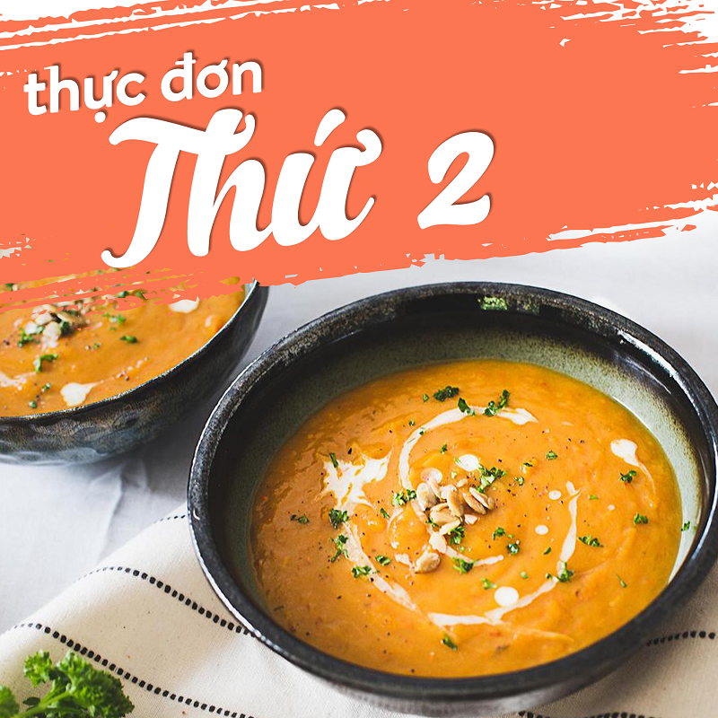 - Súp nghệ bí đỏ (Bí đỏ gọt vỏ hấp tán nhuyễn xào với hành tây, nghệ cắt lát, dầu olive, thêm nước dùng gà vào)