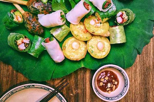 Món cuốn tổng hợp cùng lá sen và rau rừng.