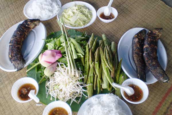 Mỗi món được bày lên tưởng như mang theo chút gió từ ao sen lồng lộng, có mùi hương cây cỏ xứ miệt vườn lướt qua mũi, thoảng qua tai. Món nào cũng đi kèm nhiều loại rau. Đặc biệt, các loại lá đặc sản nhà quê như lá cóc, lá mè, lá chúc, rau rừng khi ăn kèm với các món cuốn hay chiên nướng đều để lại vị chua tươi mát.