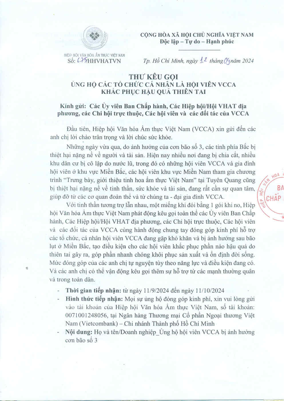 THƯ KÊU GỌI ỦNG HỘ CÁC TỔ CHỨC CÁ NHÂN LÀ HỘI VIÊN VCCA KHẮC PHỤC HẬU QUẢ THIÊN TAITác giảAdministrator17:02 - 12/09/2024 Chia sẻ: